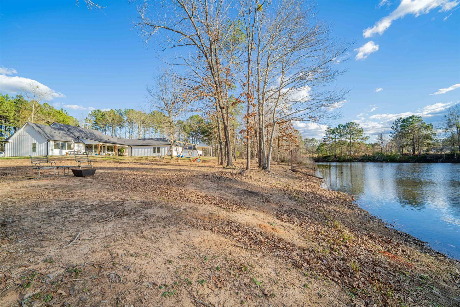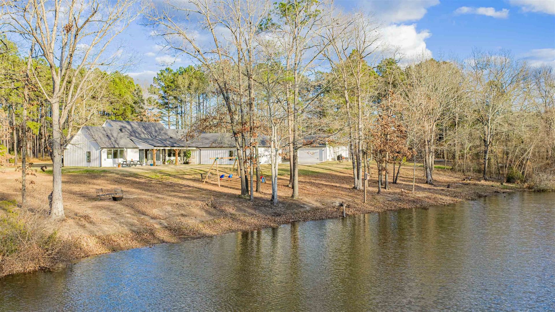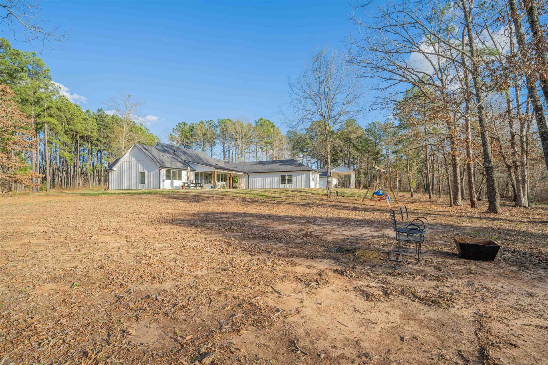 An exceptional opportunity to own a nearly new, custom - quality modern home by JMA Design, on 5 private acres within a gated community, offering refined design, flexibility and East Texas serenity just minutes from Longview and surrounding communities of Kilgore, Henderson, Lake Cherokee! Built only 2 years ago, this thoughtfully designed home offers 2888 sq. ft of heated/cooled living space, featuring a vaulted ceiling and floor-to-ceiling stone gas fireplace that anchors the open living area and includes a ventilation system above mounted television. Custom cabinetry is built throughout the entire home, providing elevated craftsmanship, abundant storage and timeless appeal. The flexible floor plan includes 4 bedrooms or 3 bedrooms with a generous bonus room, a dedicated office and 3 full bathrooms. The floorplan is ideal for families, guests or those working from home. The layout offers both openness and privacy, making it well suited for living/entertaining. The primary suite is oversized and leads into a spacious bath with large shower, bathtub, separate vanity areas and an extra-large closet, designed for 2 people! Outdoors, the property delivers a rare lifestyle experience with 5 private acres, a large pond (shared with1 other home on opposite side of pond), a fully equipped shop and an RV cover with full hookups. The covered back porch of home has gas hookups and 50-amp plug, perfect for a hot tub. Full home generator is 24KW Generac and runs off propane. Whether hosting gatherings, enjoying quiet evenings by the water, fishing, pursing hobbies, etc, the land offers both beauty and function. Located outside city limits within a gated community, this property offers the benefits of privacy and fewer restrictions while remaining conveniently close to Longview and Kilgore.