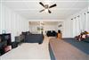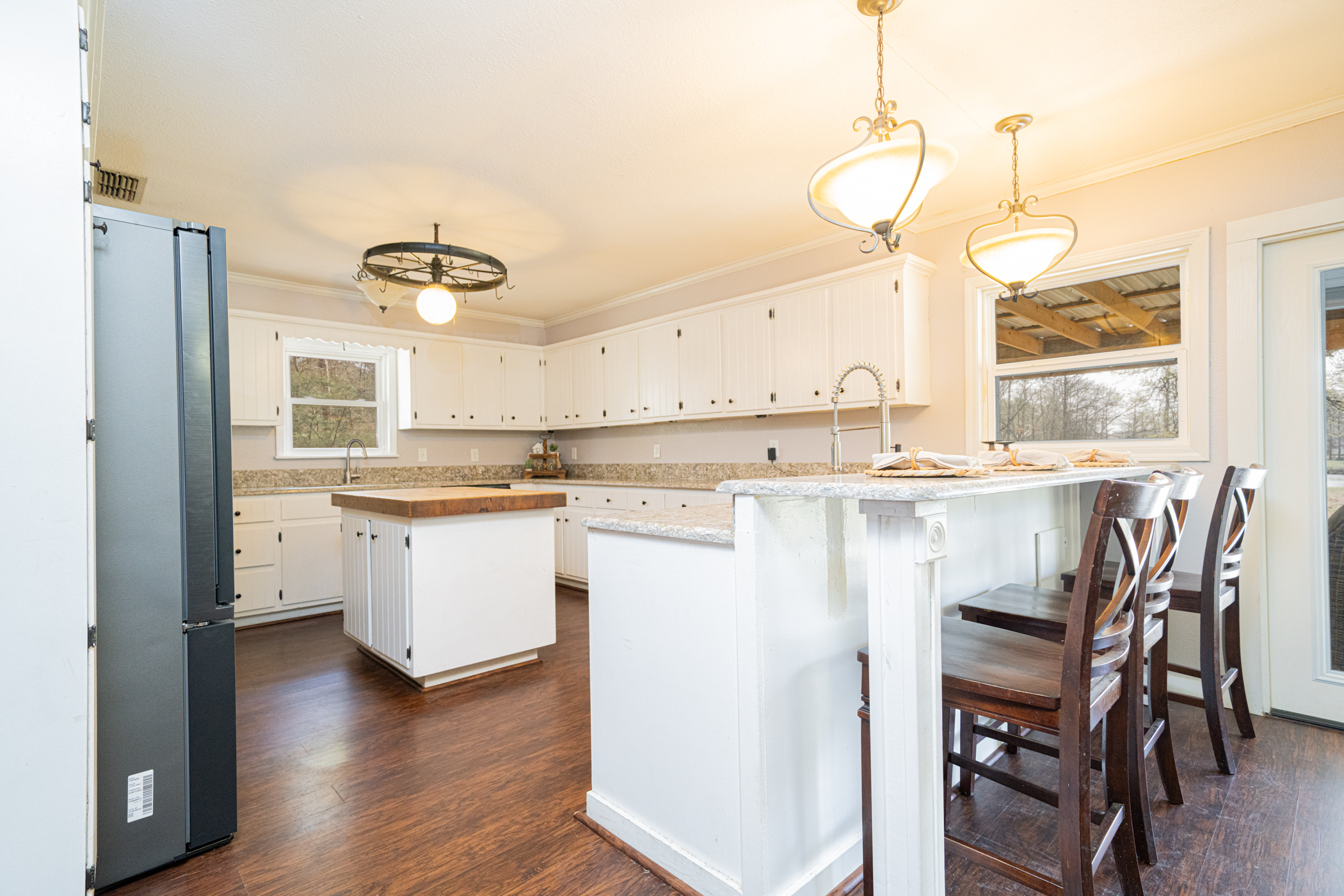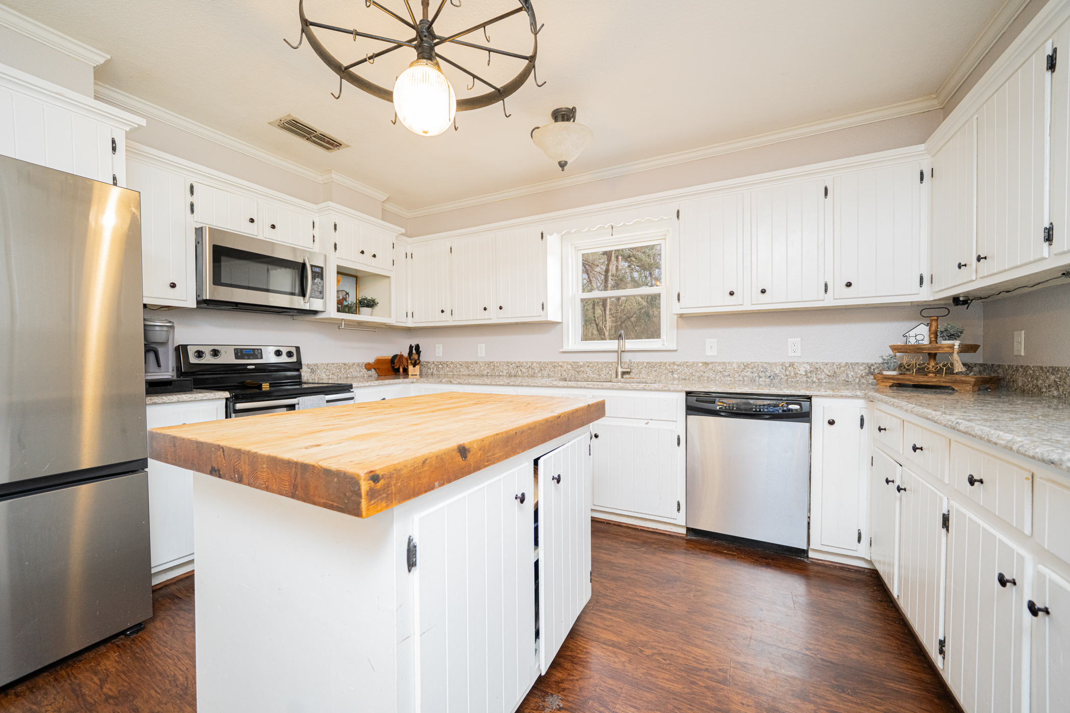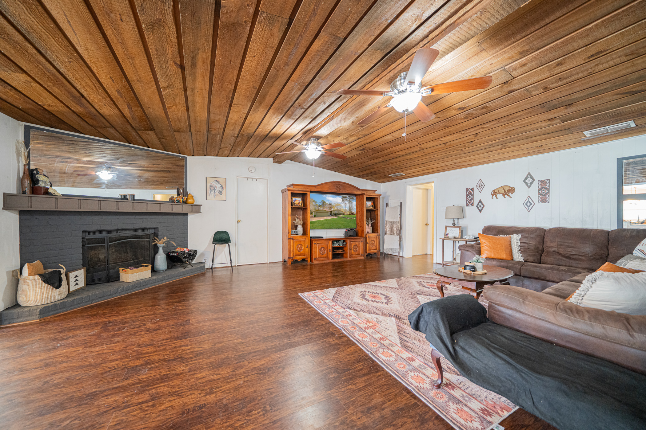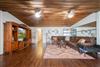 Inside, the home boasts a well-designed layout with a spacious kitchen and dining combo, complete with a bar for casual seating. Stainless steel appliances enhance the kitchen, offering both style and functionality. A cozy wood-burning fireplace serves as the focal point of the living area, creating a warm and inviting atmosphere.