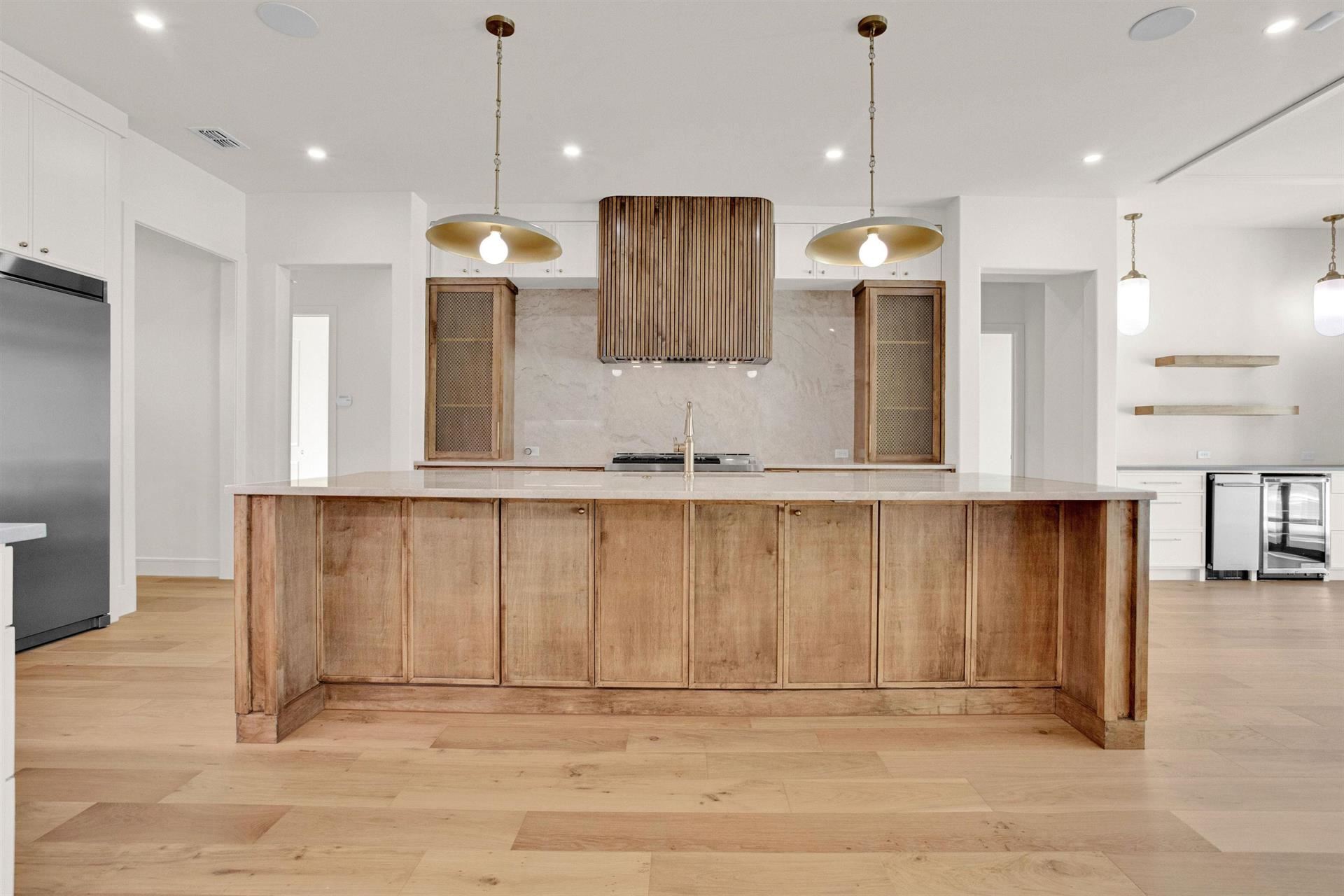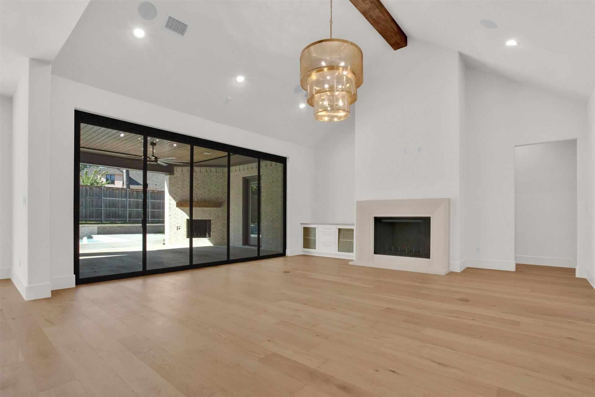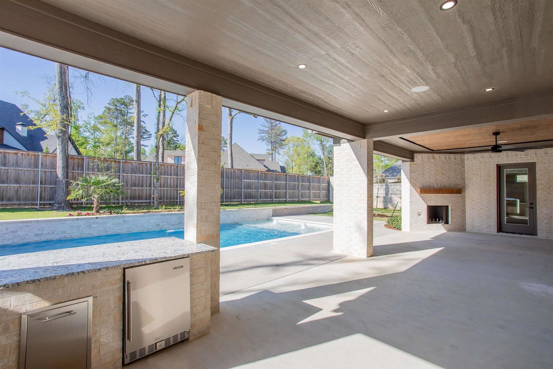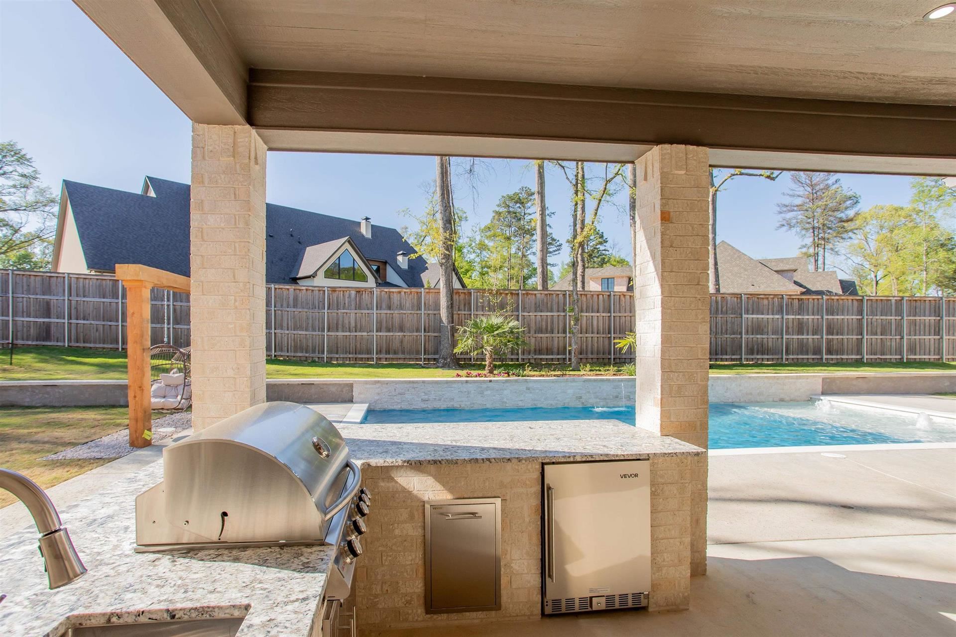Luxury new construction residence in the prestigious gated community of Sentinel Park at Legacy Bend. This refined expression of traditional luxury offers 5 bedrooms plus a dedicated office, 3.5 bathrooms, with 4,155 square feet of thoughtfully designed living space. A cohesive interior unfolds through custom built-ins, layered lighting, wood flooring, continuous surround sound, and expansive slide and stack doors. The kitchen showcases its beautiful slim shaker 2 tone cabinets, custom vent hood and Taj Mahal Quartzite surfaces that extend from the countertops into a full-height backsplash. The Butlers pantry has a drawer microwave, dedicated freezer space, and abundant storage. The separate dining area is elevated by a built in bar complete with a beverage fridge and ice maker. The primary suite offers a private retreat with elevated finishes, including a makeup vanity mirror, hidden drawer storage, bidet toilet, multi-head shower, soaking tub, and thoughtfully incorporated built-ins. Additional features such as a pull-down third rack system and a retractable central vacuum with vac pan further enhance everyday convenience. Secondary spaces maintain the same level of detail, with custom closet systems, a porcelain slab vanity in the hall bath, and a powder bath with outdoor access and LED mirror. Slide-and-stack doors open to a backyard paradise anchored by a gunite pool. The covered patio features an outdoor kitchen that is fully equipped with a 32' Blaze gas grill, Vevor beverage cooler, and a 2nd fireplace.