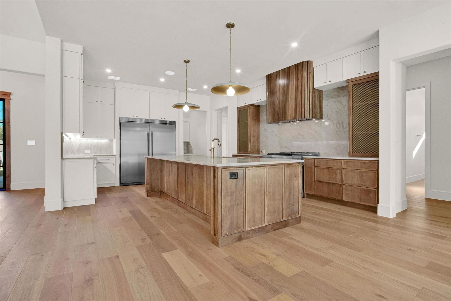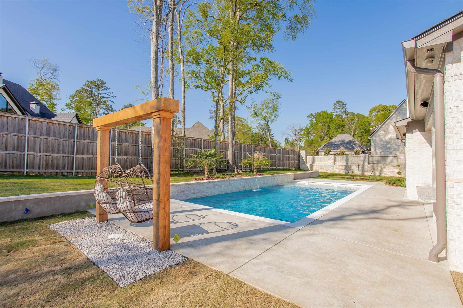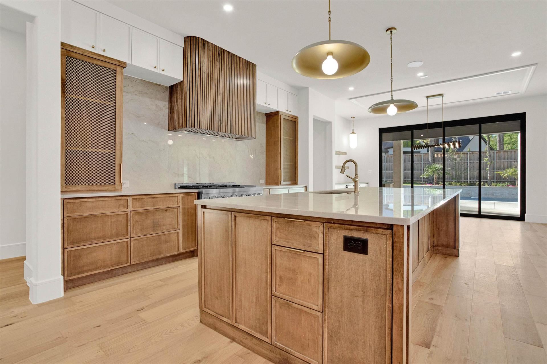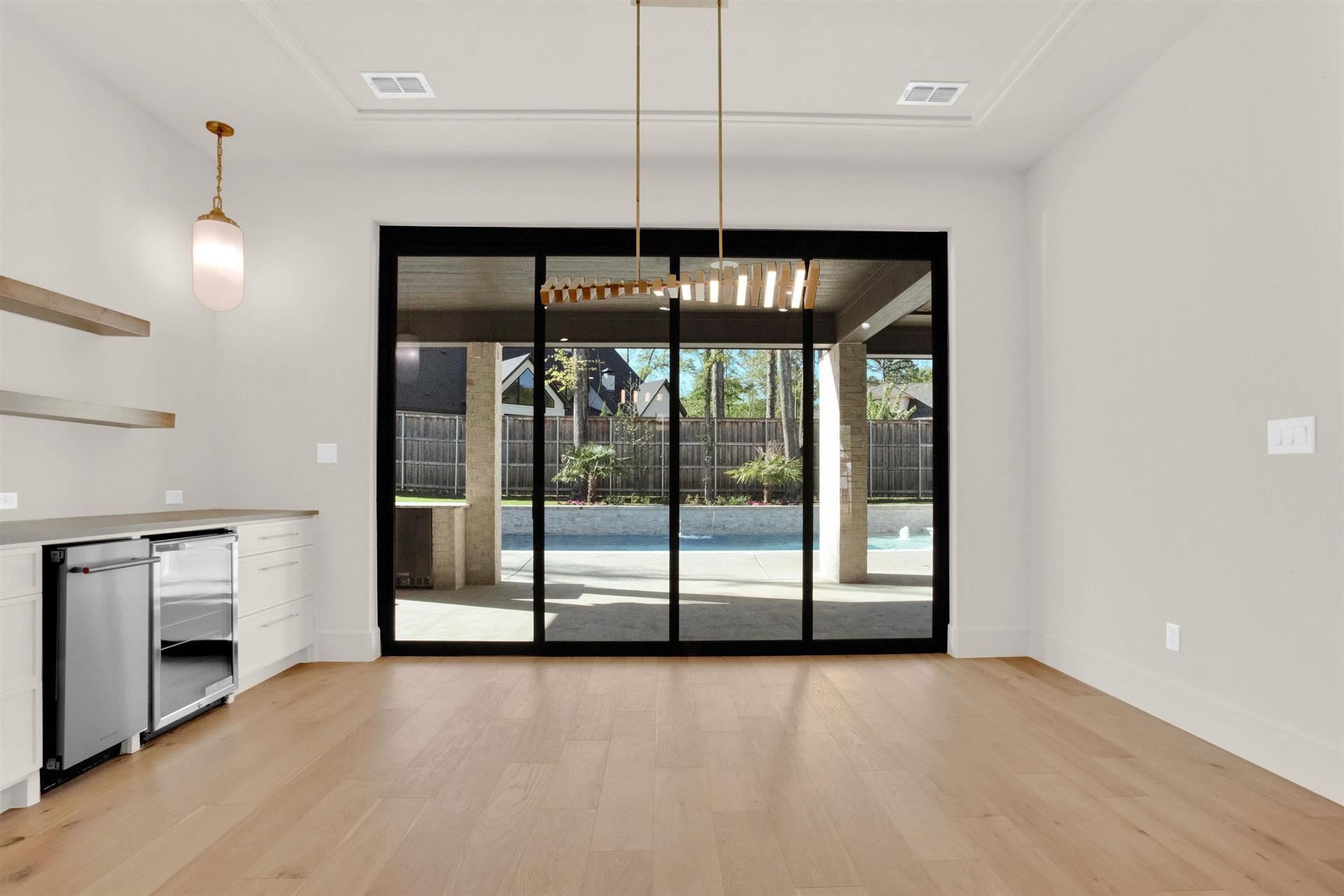 Luxury new construction residence in the prestigious gated community of Sentinel Park at Legacy Bend. This refined expression of traditional luxury offers 5 bedrooms plus a dedicated office, 3.5 bathrooms, with 4,155 square feet of thoughtfully designed living space. A cohesive interior unfolds through custom built-ins, layered lighting, wood flooring, continuous surround sound, and expansive slide and stack doors. The kitchen showcases its beautiful slim shaker 2 tone cabinets, custom vent hood and Taj Mahal Quartzite surfaces that extend from the countertops into a full-height backsplash. The Butlers pantry has a drawer microwave, dedicated freezer space, and abundant storage. The separate dining area is elevated by a built in bar complete with a beverage fridge and ice maker. The primary suite offers a private retreat with elevated finishes, including a makeup vanity mirror, hidden drawer storage, bidet toilet, multi-head shower, soaking tub, and thoughtfully incorporated built-ins. Additional features such as a pull-down third rack system and a retractable central vacuum with vac pan further enhance everyday convenience. Secondary spaces maintain the same level of detail, with custom closet systems, a porcelain slab vanity in the hall bath, and a powder bath with outdoor access and LED mirror. Slide-and-stack doors open to a backyard paradise anchored by a gunite pool. The covered patio features an outdoor kitchen that is fully equipped with a 32' Blaze gas grill, Vevor beverage cooler, and a 2nd fireplace.